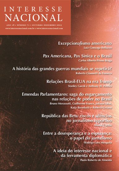 O excepcionalismo do atual momento americano ganha na Revista Interesse Nacional artigos que aprofundam o debate mundial sobre o agravamento das condições em que economia e política se veem inseridas. A dívida pública americana atinge, em 2025, a astronômica cifra de US$ 36 trilhões, acima de 100% do valor de seu PIB. Um cenário desafiador e que contribuiu para o surgimento do movimento nacionalista que reelegeu Donald Trump e que alimenta especulações sobre a possiblidade de que a era da Pax Americana esteja chegando ao fim, ao mesmo tempo que cresce o poderio econômico e militar da China.