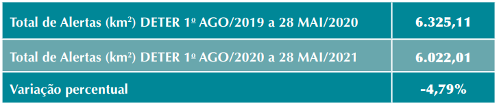 Tabela 1 – Área de Alertas de Desmatamento entre 1o de agosto/2019 a 28 de maio/2020 e 1o de agosto/2020 a 28 de maio/2021. Fonte: Inpe