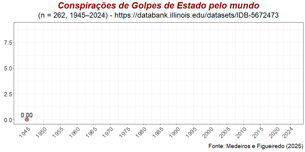 Apesar de um repique a partir de 2020, o nível da série nos últimos 25 anos é nitidamente inferior ao que foi praticado no pós-Segunda Guerra Mundial. Por fim, é possível examinar a variação da quantidade de conspirações de golpes de estado entre 1945 e 2024.