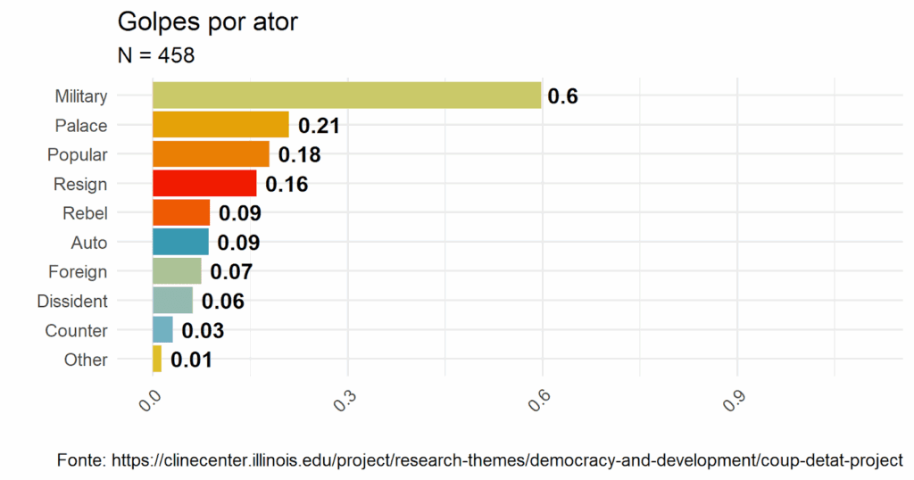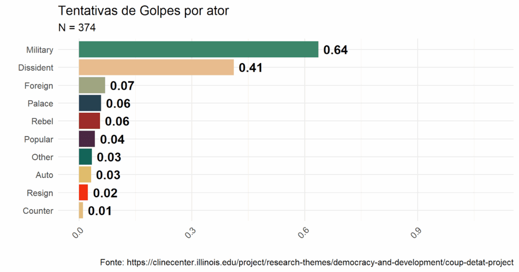 Depois de examinar a distribuição dos eventos por tipo e ao longo do tempo, o próximo passo é avaliar que atores políticos atuam para metamorfosear o Estado de acordo com seus interesses. A Figura 4 ilustra a proporção de golpes bem sucedidos por ator.