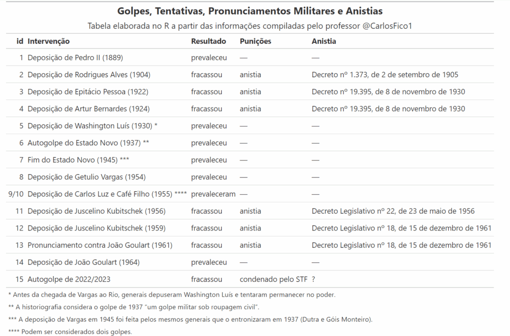 Em 18 de setembro de 2024 a Câmara dos Deputados aprovou a urgência para votar um projeto que prevê a anistia aos condenados por atos antidemocráticos e tentativa de golpe de Estado em 8 de janeiro de 2023. O professor Carlos Fico, do Departamento de História da Universidade Federal do Rio de Janeiro, organizou uma tabela síntese com os golpes, as tentativas de golpe e os resultados políticos das punições. Usamos o software R, com o pacote gt, para reproduzir esse conteúdo integralmente na Tabela 3.