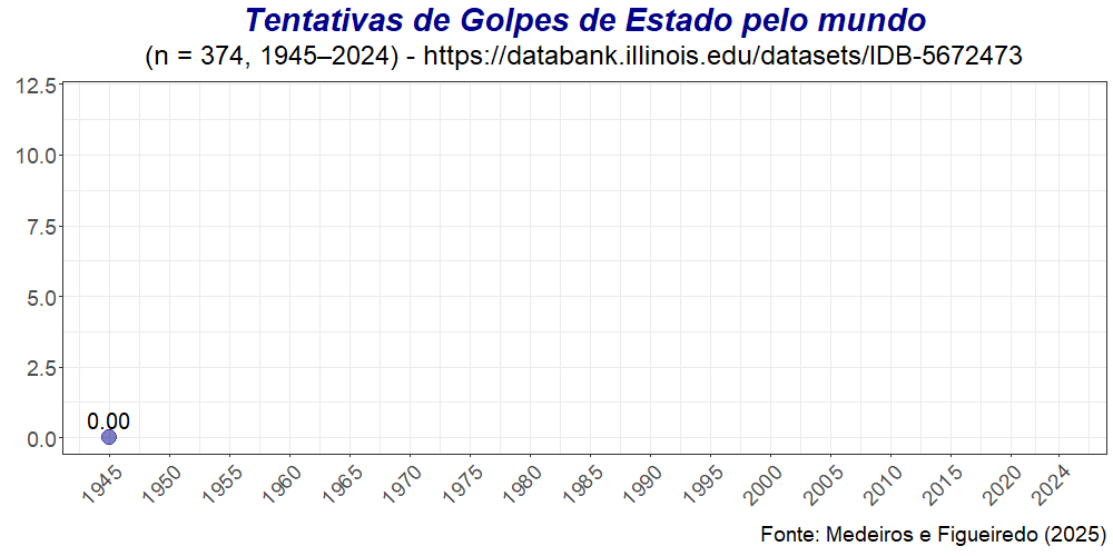 A Figura 1 ilustra a variação da quantidade de golpes de estado bem sucedidos pelo mundo entre 1945 e 2024.