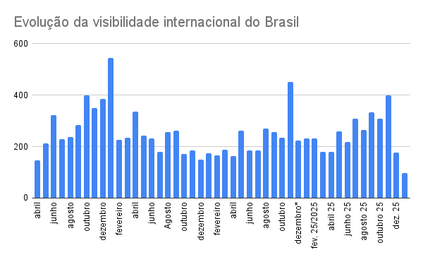 O noticiário sobre o Brasil no exterior na primeira semana completa de janeiro continuou bastante influenciado pela movimentação geopolítica global, especialmente com as ações dos Estados Unidos na Venezuela. Entre os assuntos brasileiros de maior visibilidade no resto do mundo no período, os principais destaques foram o veto do presidente Luiz Inácio Lula da Silva ao projeto de lei que reduziria pena de golpistas condenados pelo STF, e o acordo entre o Mercosul e a União Europeia – ambas com uma abordagem mais positiva do que negativa sobre o país.