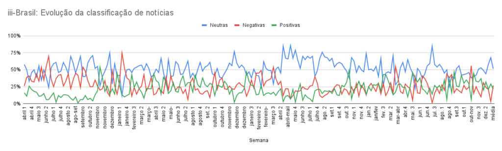 Ao longo do levantamento, o iii-Brasil registrou em média 51% de reportagens de tom neutro, 27% de menções com tom negativo e 22% de textos positivos sobre o país.