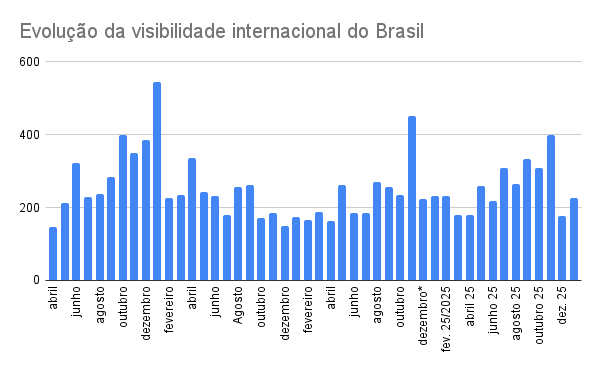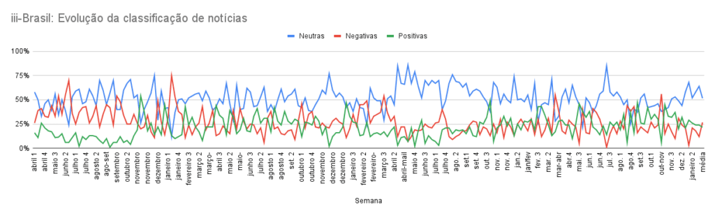 Ao longo do levantamento, o iii-Brasil registrou em média 52% de reportagens de tom neutro, 27% de menções com tom negativo e 22% de textos positivos sobre o país.