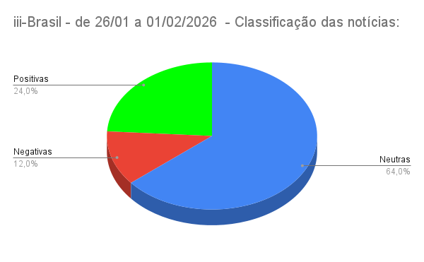 No total, foram registrados na última semana de janeiro 41 textos com menção ao Brasil nos sete veículos analisados, volume abaixo da média semanal do Índice de Interesse Internacional (iii-Brasil). O período registrou uma maioria de textos de tom neutro (64%) e uma proporção maior de menções positivas (24%) do que de repercussão negativa (12%).