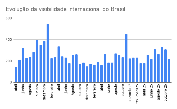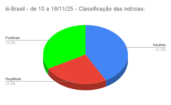 No total, foram registrados na segunda semana de novembro 112 textos com menção ao Brasil nos sete veículos analisados, volume que é quase o dobro da média semanal do Índice de Interesse Internacional (iii-Brasil). O período registrou uma maioria de textos de tom neutro (42%), 33% de menções positivas e 25% de repercussão negativa.