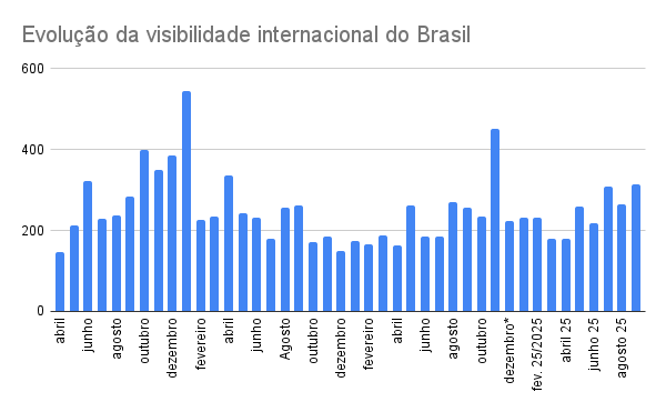 Desde o início de abril de 2022, o iii-Brasil coletou e analisou em média 58 reportagens por semana com menções de destaque ao país nos sete veículos de imprensa analisados.