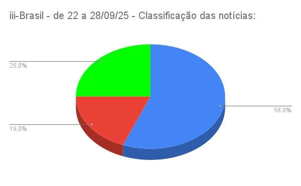 No total, foram registrados na quarta semana de setembro 64 textos com menção ao Brasil nos sete veículos analisados, volume acima da média semanal do Índice de Interesse Internacional (iii-Brasil). O período registrou uma maioria de textos de tom neutro (56%), 25% de menções positivas e 19% de repercussão negativa.