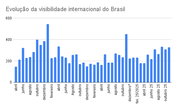 No total, foram registrados na terceira semana de novembro 112 textos com menção ao Brasil nos sete veículos analisados, volume que é quase o dobro da média semanal do Índice de Interesse Internacional (iii-Brasil). O período registrou uma maioria de textos de tom neutro (51%), 32% de menções positivas e 17% de repercussão negativa.