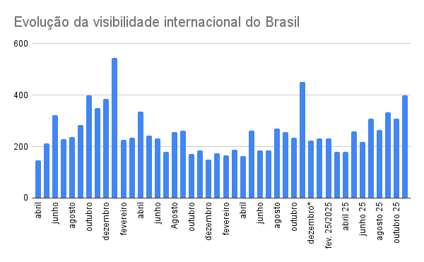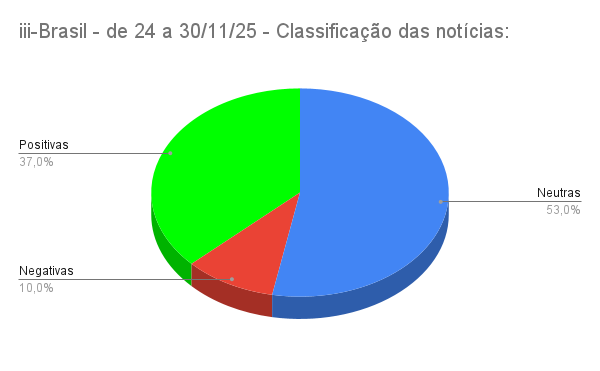 No total, foram registrados na quarta e última semana de novembro 72 textos com menção ao Brasil nos sete veículos analisados, volume maior do que a média semanal do Índice de Interesse Internacional (iii-Brasil). No total, foram 400 menções ao país no mês, o terceiro maior volume de cobertura internacional sobre o Brasil desde o começo do levantamento de dados do índice, em 2022. O período registrou uma maioria de textos de tom neutro (53%), 37% de menções positivas e só 10% de repercussão negativa.