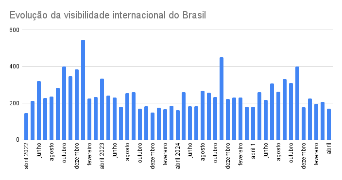 O Brasil foi retratado com imagem mais positiva do que negativa nas duas que se aproximam do fim do mês de abril, período que incluiu o feriado de Tiradentes. O país teve uma visibilidade acima da média na imprensa estrangeira, mas nenhum assunto dominou totalmente as atenções, incluindo notícias sobre política, diplomacia, cultura e esportes.