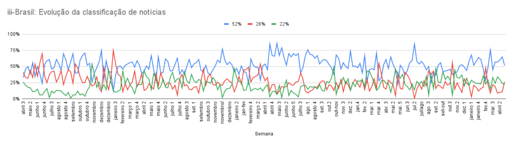 Ao longo do levantamento, o iii-Brasil registrou em média 52% de reportagens de tom neutro, 26% de menções com tom negativo e 22% de textos positivos sobre o país.
