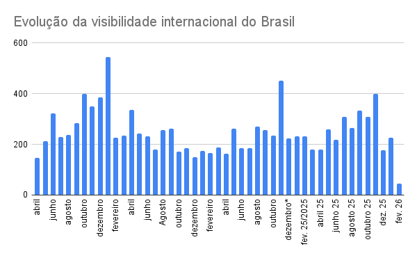 O mês de fevereiro começou com baixa visibilidade internacional para o Brasil. O país foi citado poucas vezes na imprensa estrangeira no período e não houve um tema que se repetisse em mais de um veículo da mídia do exterior. Um dos destaques foi a publicação de uma matéria especial no Monde sobre as disputas entre EUA e China na região, com atenção especial ao país.