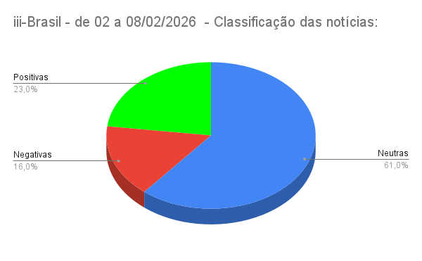 No total, foram registrados na primeira semana de fevereiro 43 textos com menção ao Brasil nos sete veículos analisados, volume abaixo da média semanal do Índice de Interesse Internacional (iii-Brasil). O período registrou uma maioria de textos de tom neutro (61%) e uma proporção maior de menções positivas (23%) do que de repercussão negativa (16%).