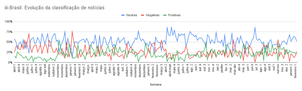Ao longo do levantamento, o iii-Brasil registrou em média 52% de reportagens de tom neutro, 27% de menções com tom negativo e 22% de textos positivos sobre o país.