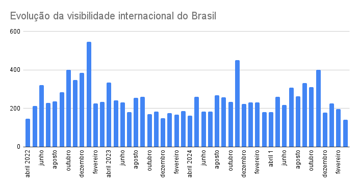 Ao longo do levantamento, o iii-Brasil registrou em média 52% de reportagens de tom neutro, 27% de menções com tom negativo e 22% de textos positivos sobre o país.