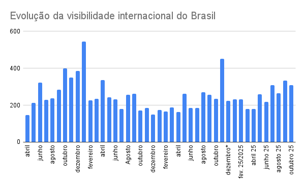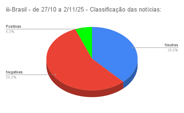 No total, foram registrados na semana de transição entre outubro e novembro 130 textos com menção ao Brasil nos sete veículos analisados, volume maior do que o dobro da média semanal do Índice de Interesse Internacional (iii-Brasil). O período registrou uma maioria de textos de tom negativo (56%), 38% de menções neutras e apenas 6% de repercussão positiva.