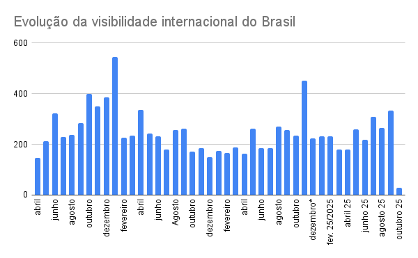 Desde o início de abril de 2022, o iii-Brasil coletou e analisou em média 58 reportagens por semana com menções de destaque ao país nos sete veículos de imprensa analisados.