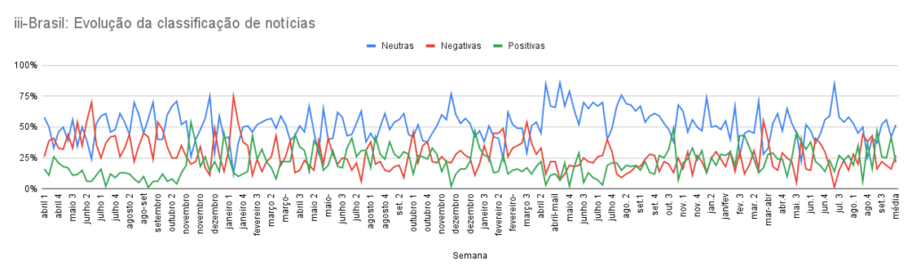 Ao longo do levantamento, o iii-Brasil registrou em média 52% de reportagens de tom neutro, 27% de menções com tom negativo e 21% de textos positivos sobre o país.