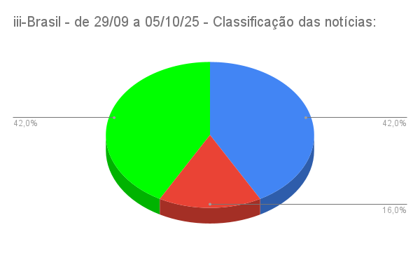 No total, foram registrados na semana de transição entre setembro e outubro 48 textos com menção ao Brasil nos sete veículos analisados, volume abaixo da média semanal do Índice de Interesse Internacional (iii-Brasil). O período registrou uma proporção igual de textos de tom neutro e positivo (42%), e apenas 16% de repercussão negativa.