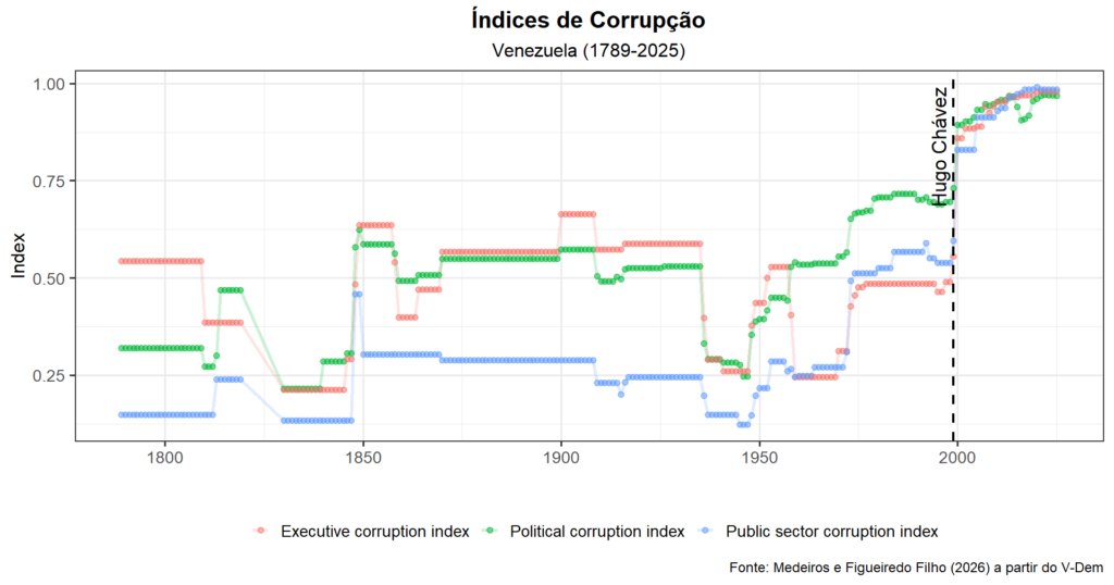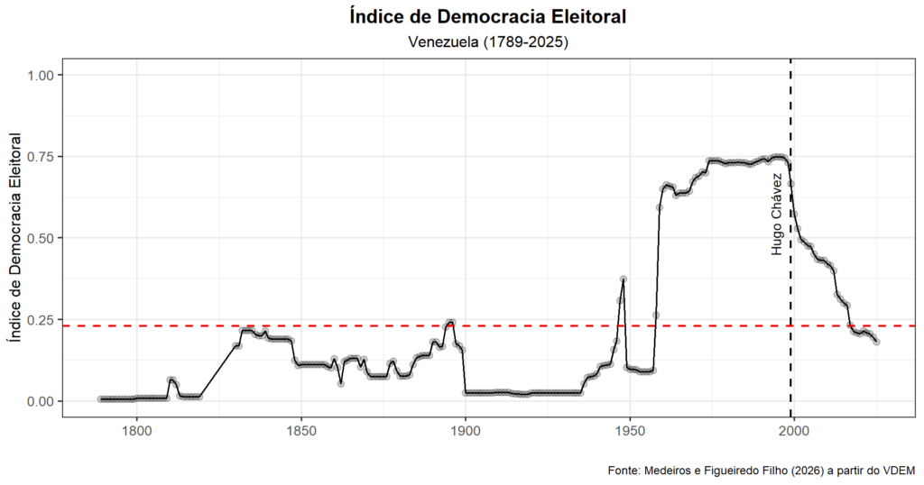 A marcação de 1999, indicando a chegada de Hugo Chávez à presidência, não coincide com uma ruptura imediata no indicador. Pelo contrário, o nível de democracia eleitoral permanece alto naquele momento, o que sugere que a mudança de regime não se deu de forma abrupta. O que se observa, a partir daí, é um processo gradual e persistente de declínio, no qual a deterioração institucional ocorre ao longo do tempo.