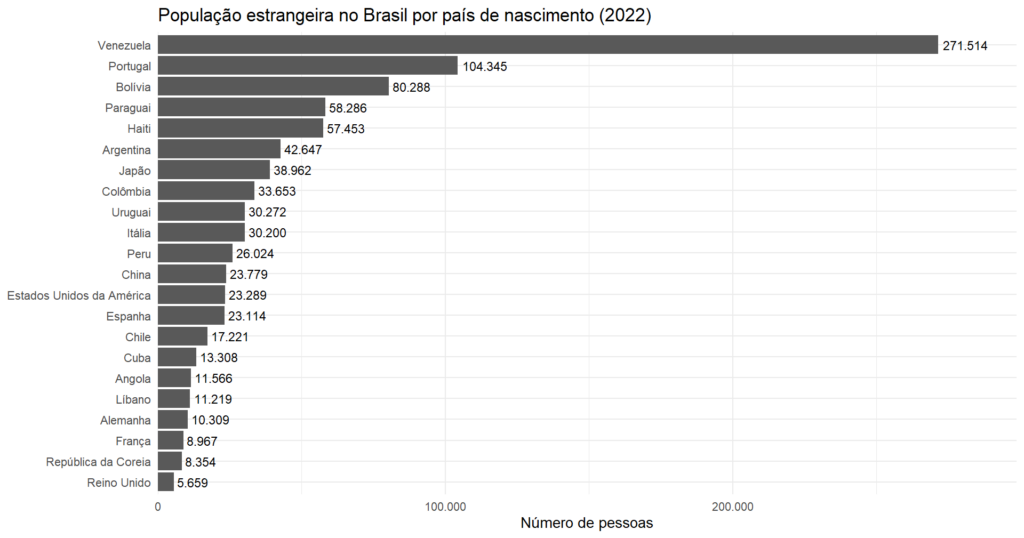 Ao se considerar a origem dos imigrantes, os dados revelam que 1 em cada 4 são venezuelanos. A Região Norte, principal porta de entrada desses migrantes, reúne 124.767 pessoas nascidas na Venezuela, o que corresponde a 45,7% do total dessa nacionalidade no Brasil. O Gráfico 3 sumariza a quantidade de estrangeiros e naturalizados brasileiros vivendo no país conforme as estimativas do Censo de 2022.